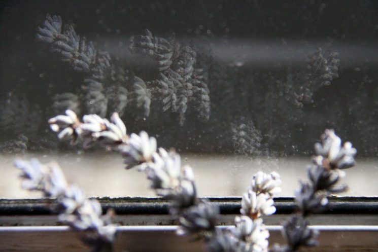 I noticed a herbal infusion steaming on the hob, beams of sunlight hitting the pot. I took my camera and began shooting an intriguing arrangement. However, my eye caught a different, potentially attractive composition. A cloud of smoke coming from the incense above the sink in the kitchen. I followed that lead only to stumble upon a lavender and its reflection in the window.