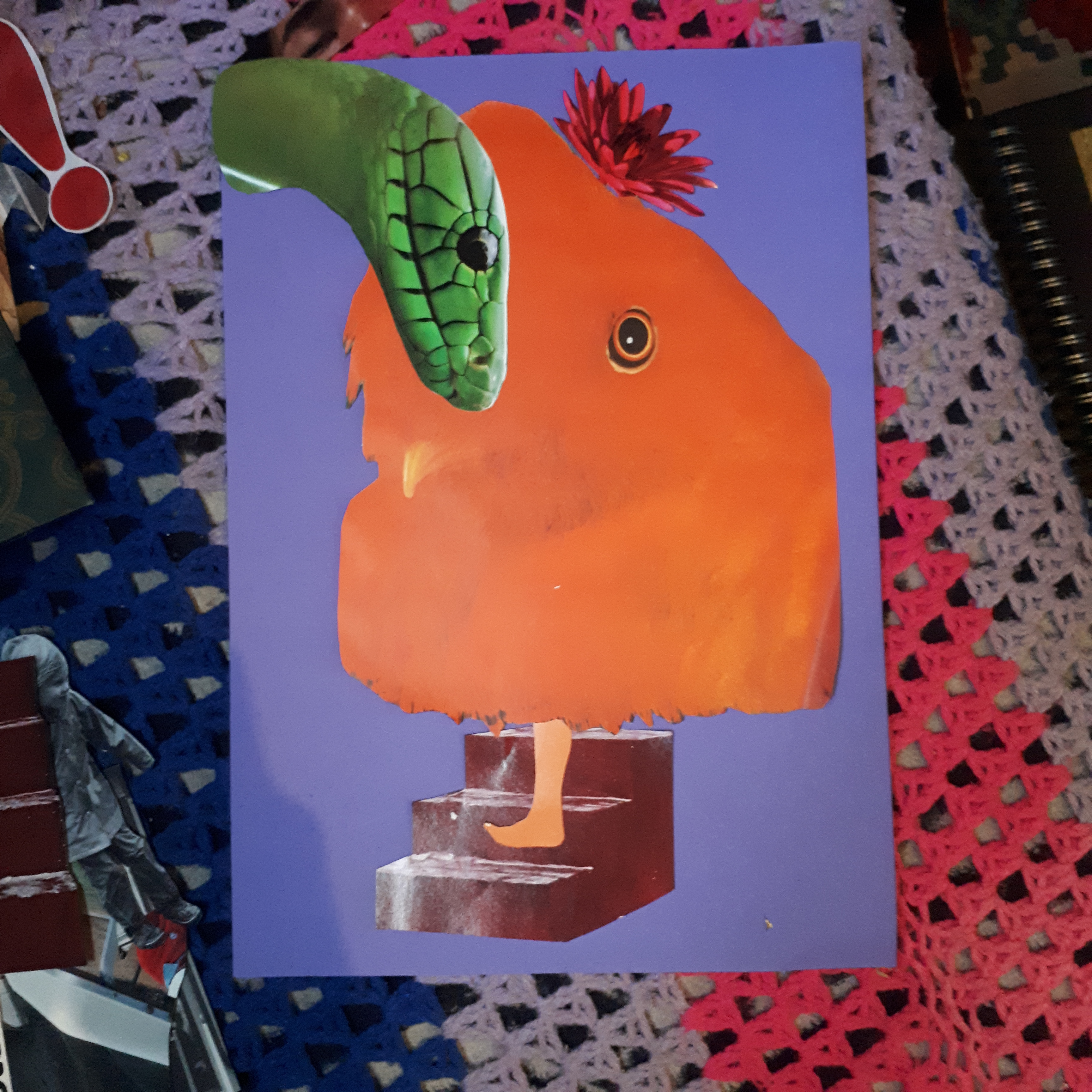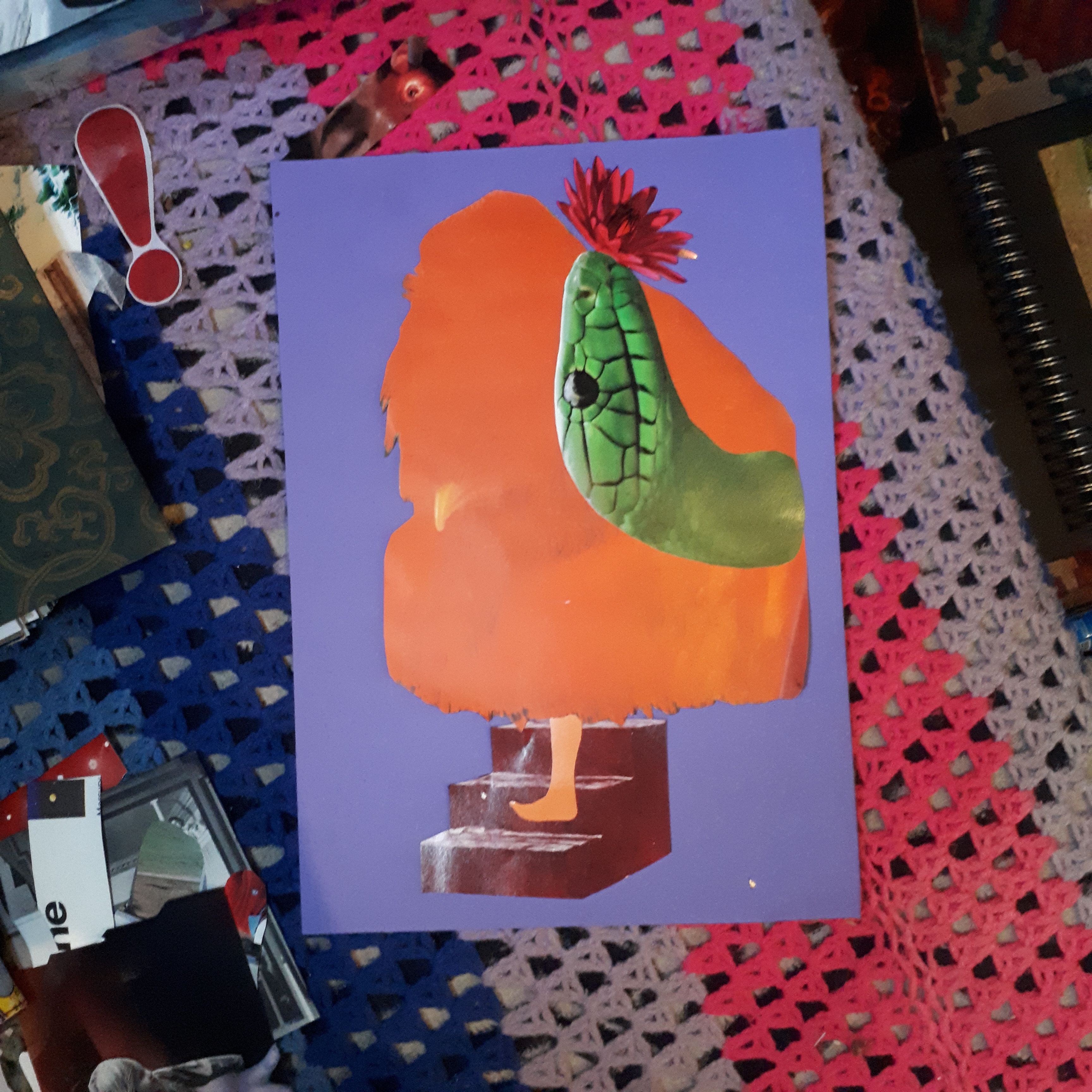 With the minimalistic method in mind, I looked through hundreds of pictures in my collage box and picked only a few that immediately made me feel something. I set them aside and put the collages, which were already assembling naturally during the search, together. I tried a few different options before finalizing the work. I found it conducive to take photos of the options I am to choose from on my phone, then comparing them to see which version is favored. After a few hours of inventing, which I thoroughly enjoyed, I created two minimalistic (I hope) collages.