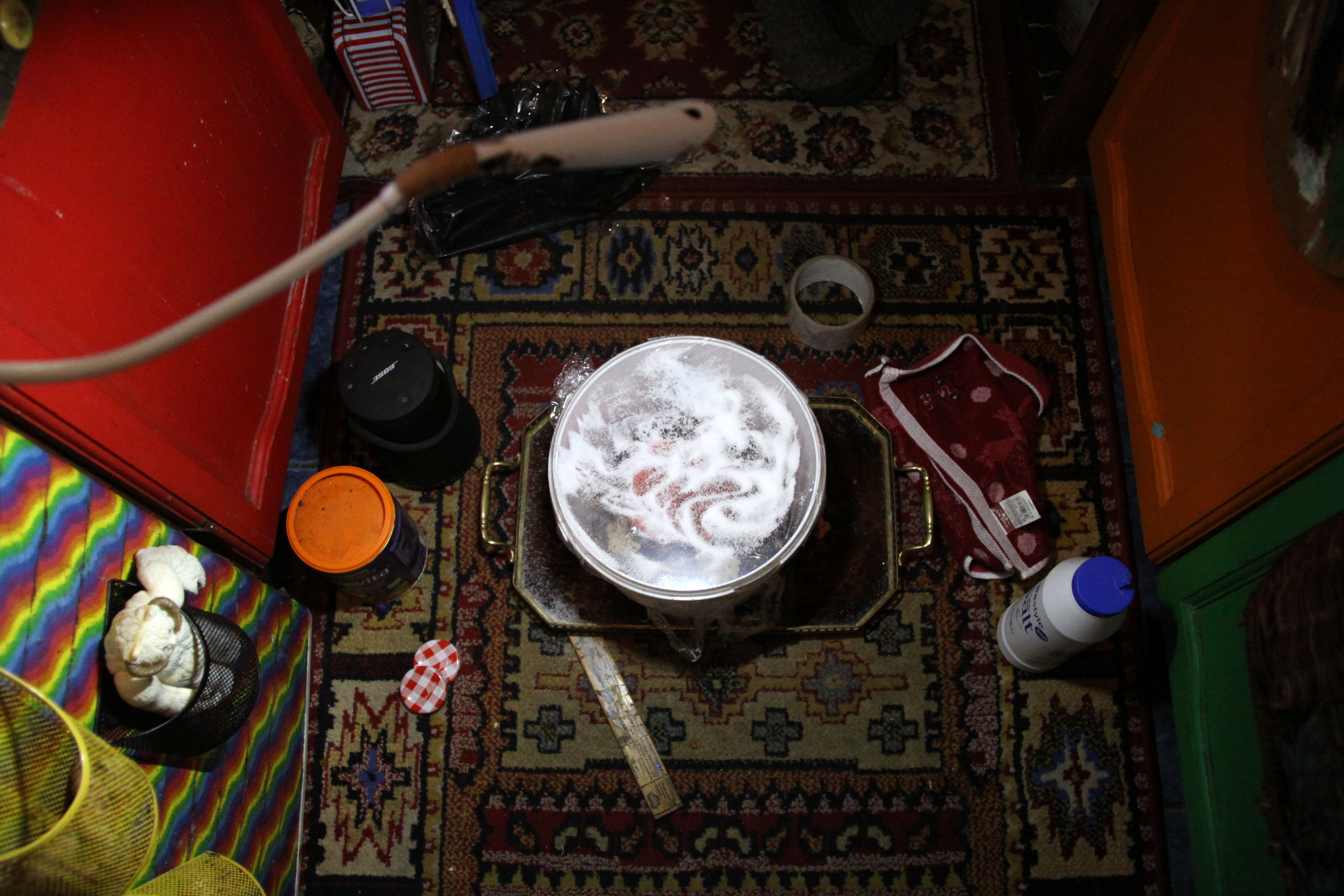 I tried, as much as possible, to balance it out (fundamentally unmanageable on a narrowboat), covered the surface in grains of salt, and placed the speaker underneath the bucket.