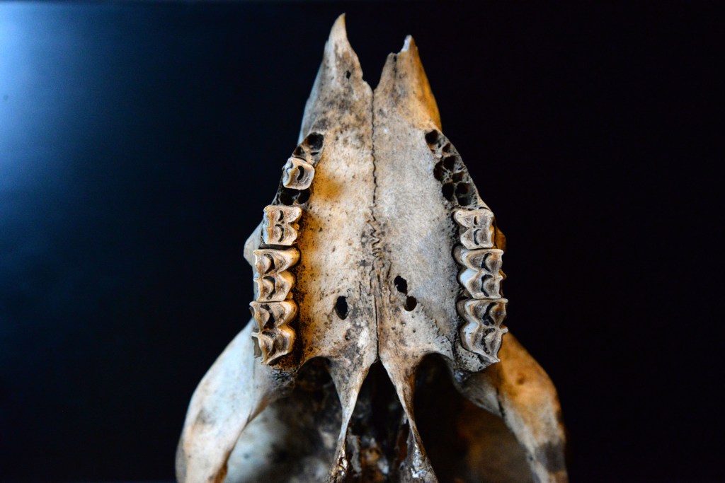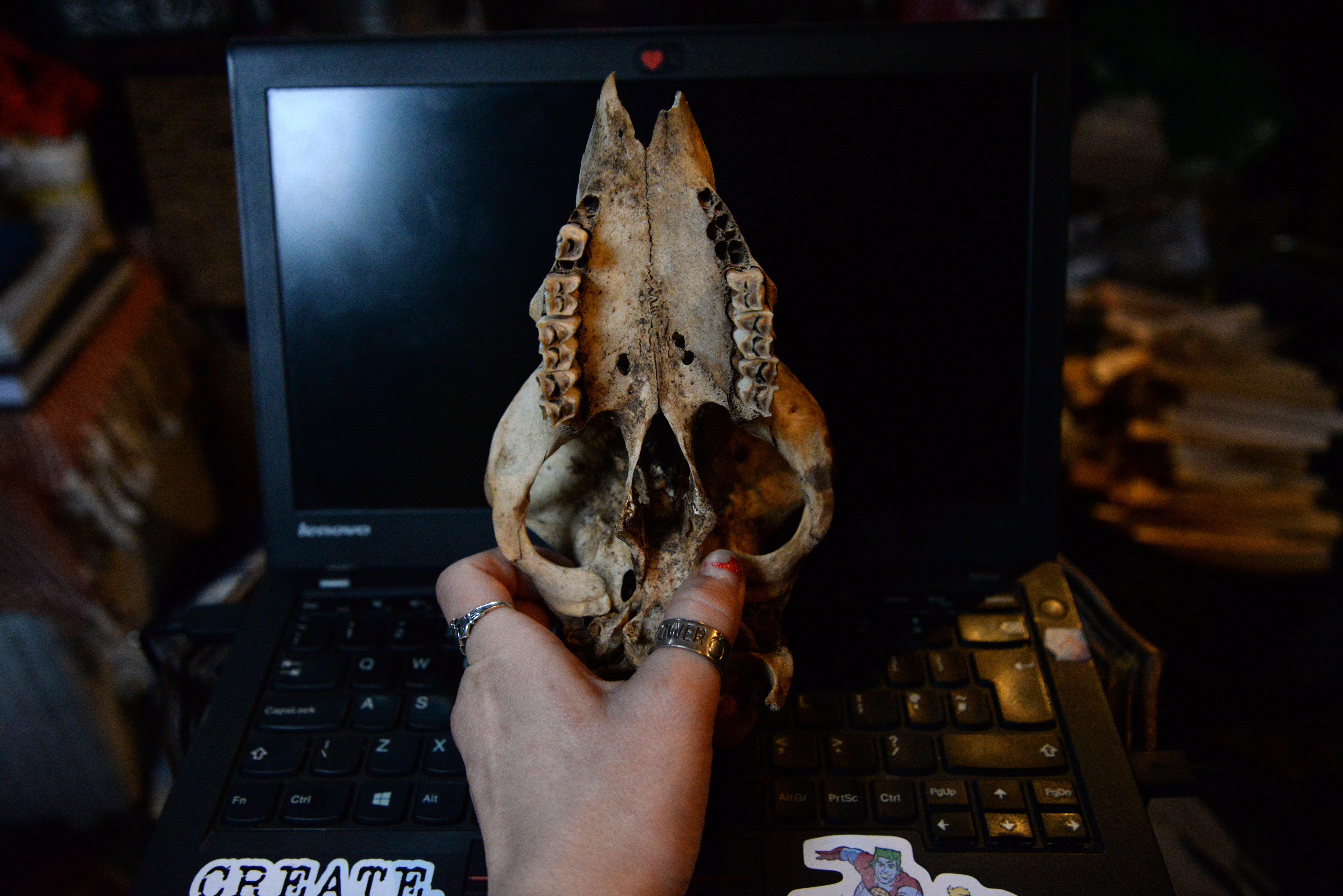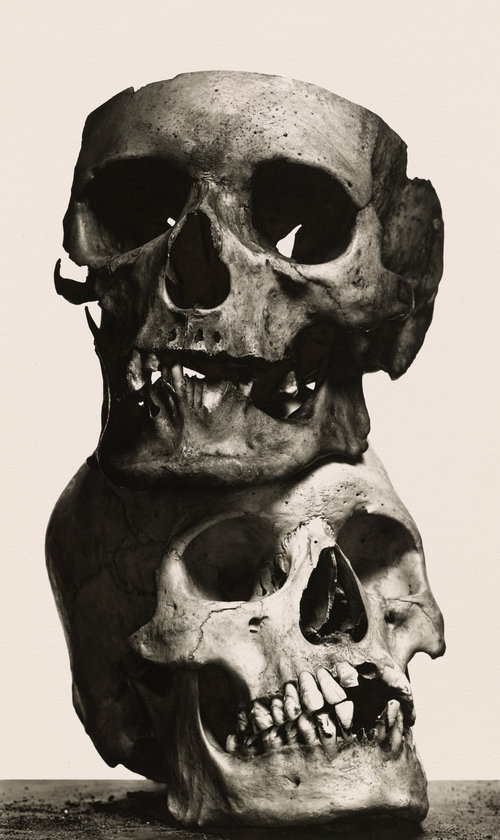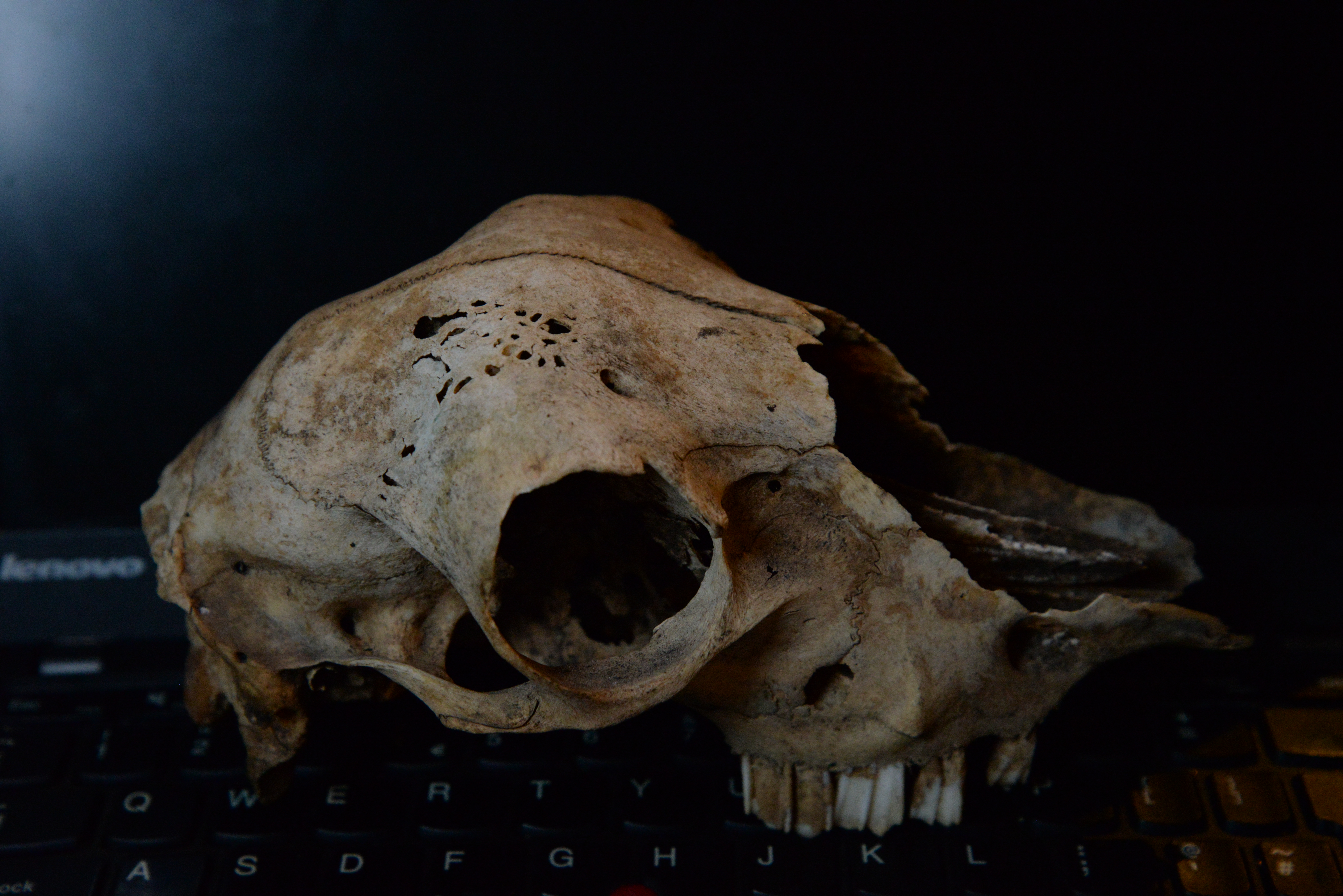 Examining the skull for the final image. Due to lack of proper walls (I live on a narrowboat), I improvise and have to very creative with planning backgrounds for my photographs. I often use a sheet of coloured paper, old, stained canvas, kitchen cupboards door, anything goes. For the skull image backdrop, I used the screen of my laptop. With an intriguing deep-blue/black colour, touched by a drop of light hitting the top right corner, I achieved a pleasing effect.