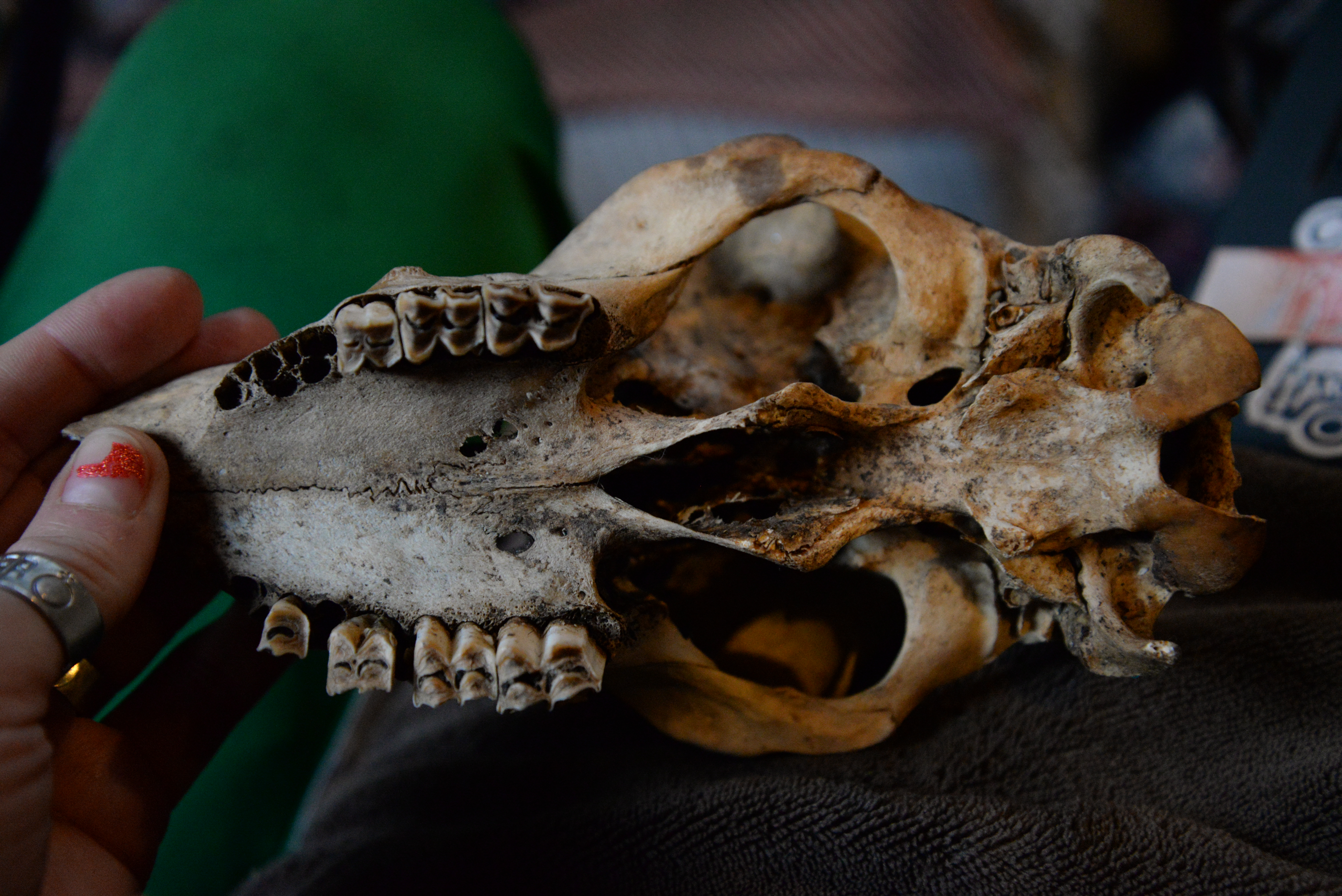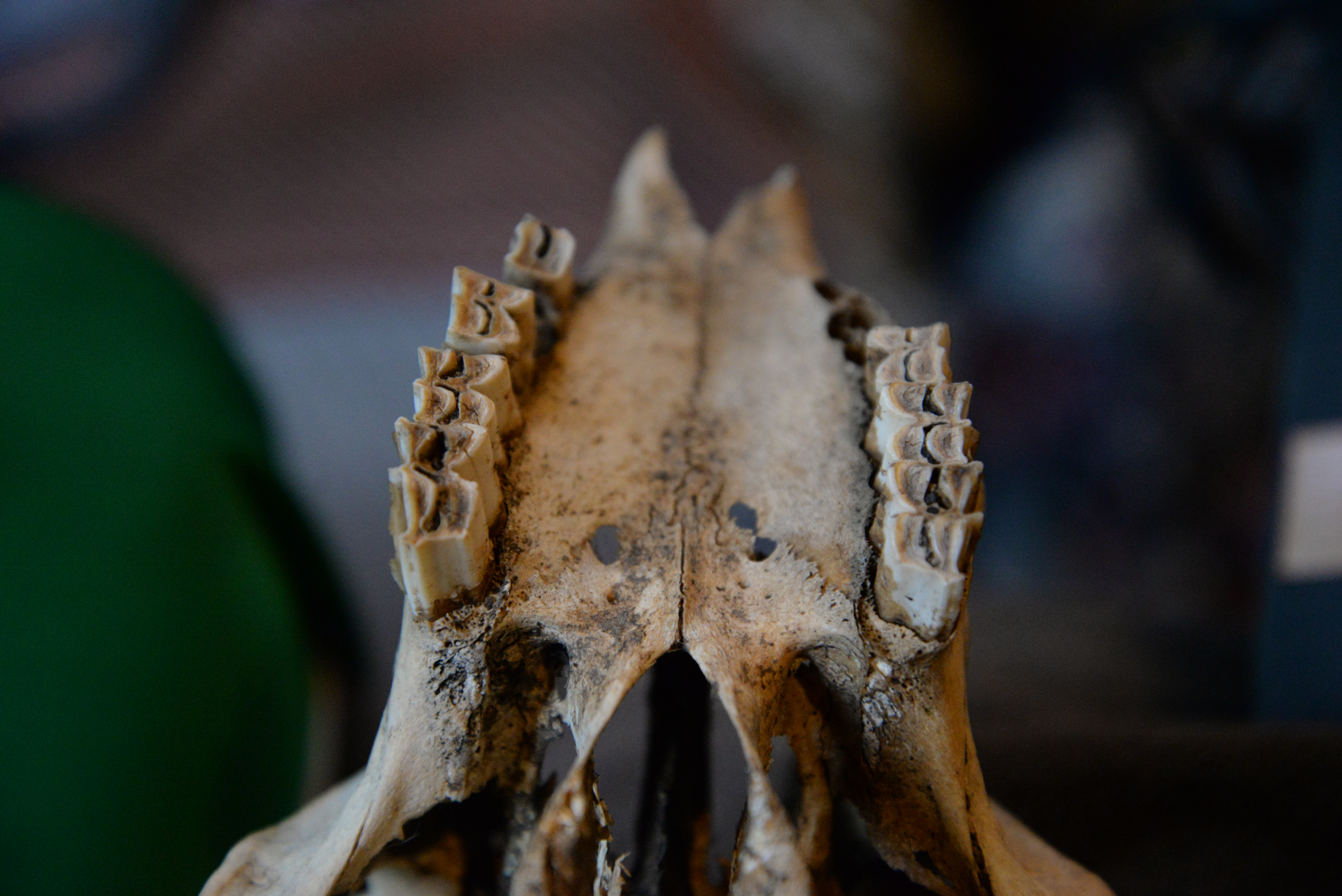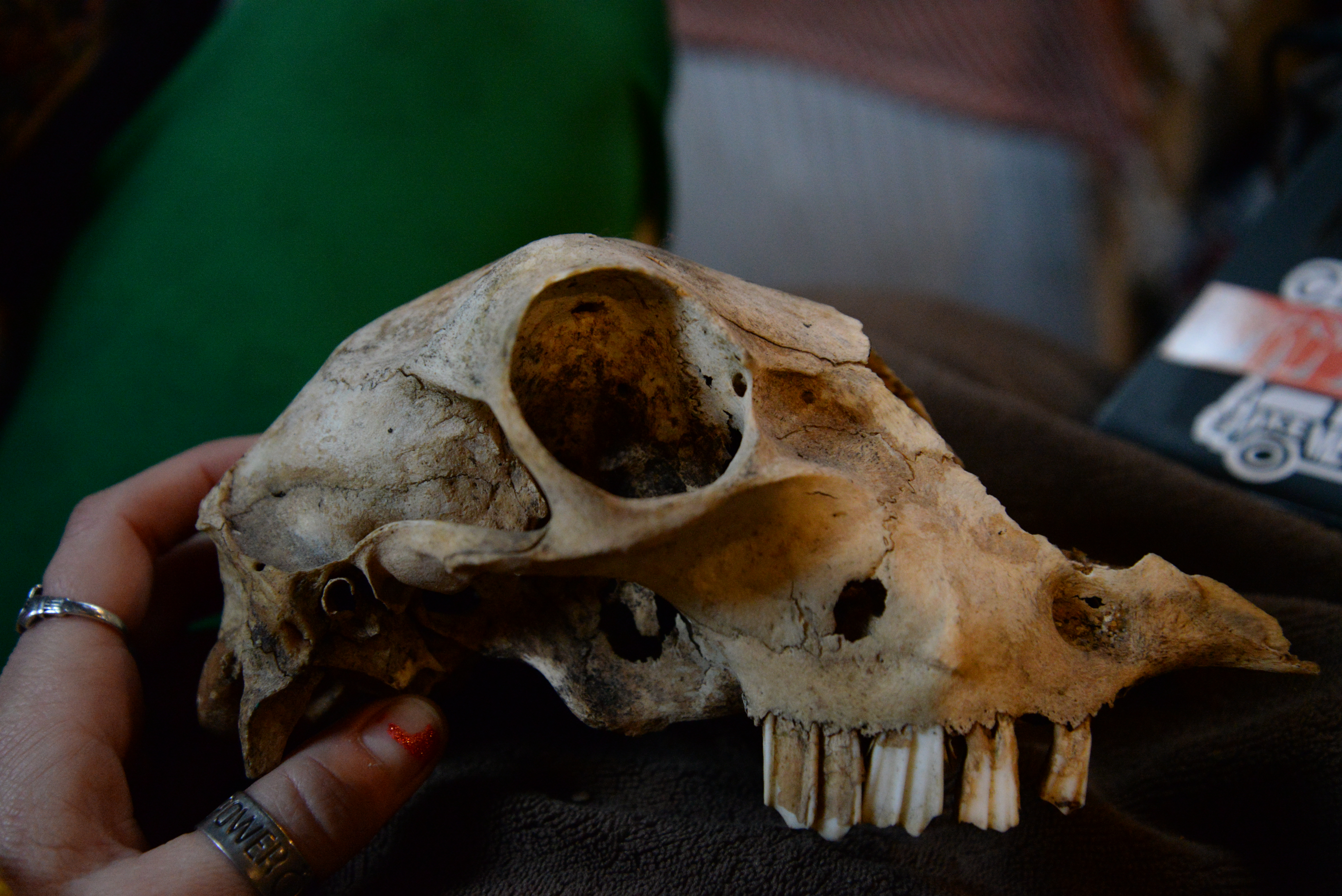 Examining the skull for the final image. Due to lack of proper walls (I live on a narrowboat), I improvise and have to very creative with planning backgrounds for my photographs. I often use a sheet of coloured paper, old, stained canvas, kitchen cupboards door, anything goes. For the skull image backdrop, I used the screen of my laptop. With an intriguing deep-blue/black colour, touched by a drop of light hitting the top right corner, I achieved a pleasing effect.