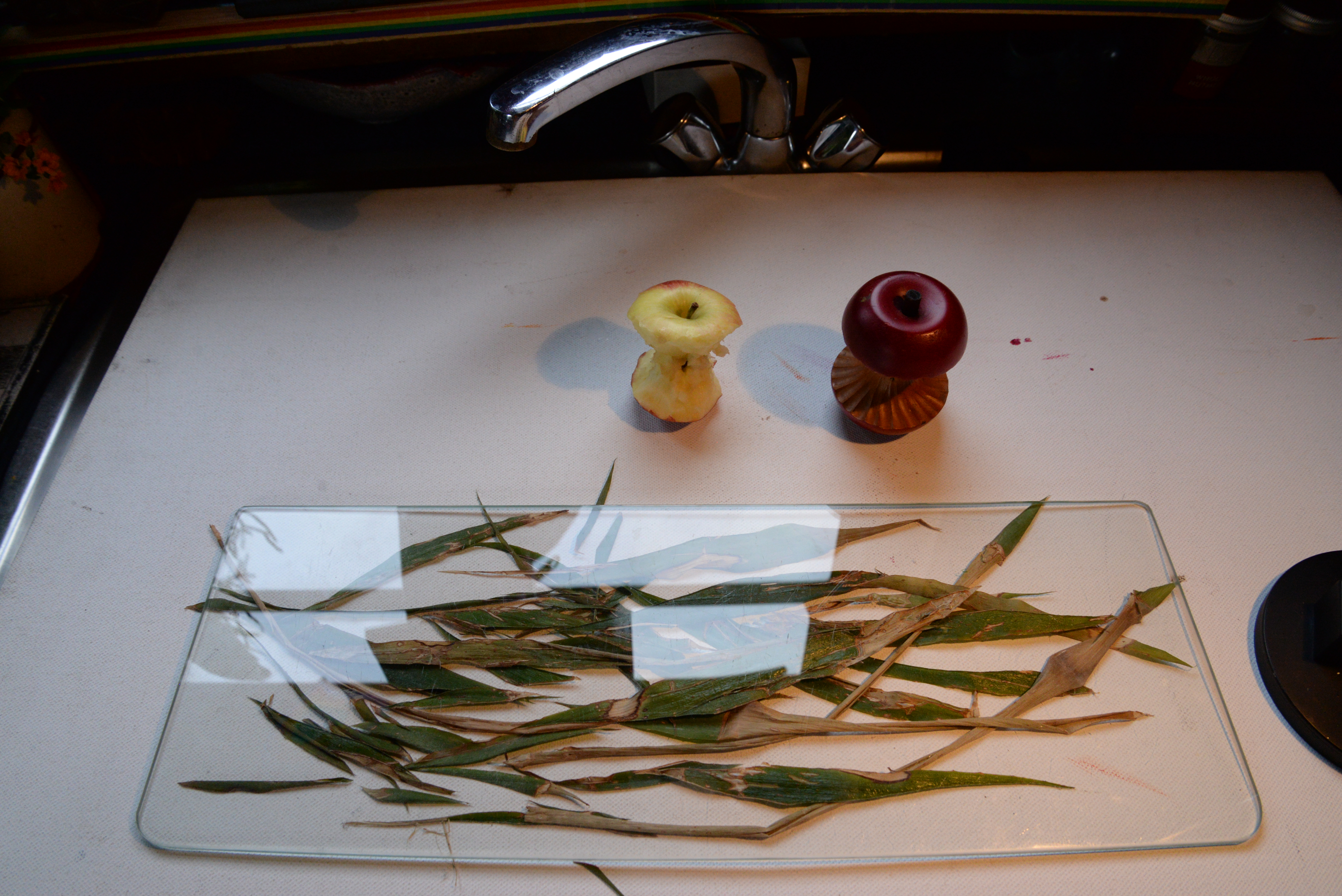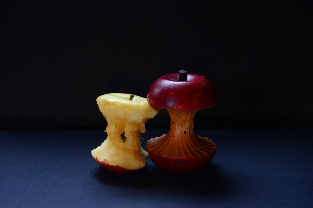 Apple arrangement, I decided to juxtapose the ‘perfect’ apple core that I have a little model of, and an actual core of an apple (that I created by eating the apple, yum). The idea was to show how the perfection we, as a society, are stiving for is A: unreal, B: unattainable. Besides, how much more beautiful is the REAL thing, with it’s uneven form and life within that stems from the imperfection itself.