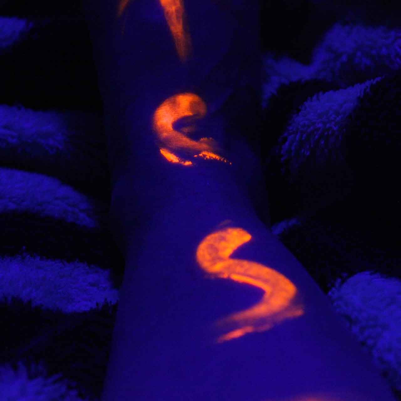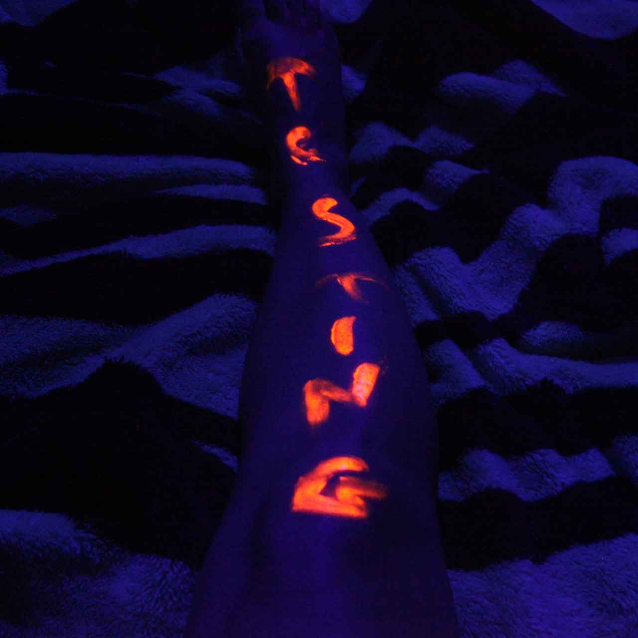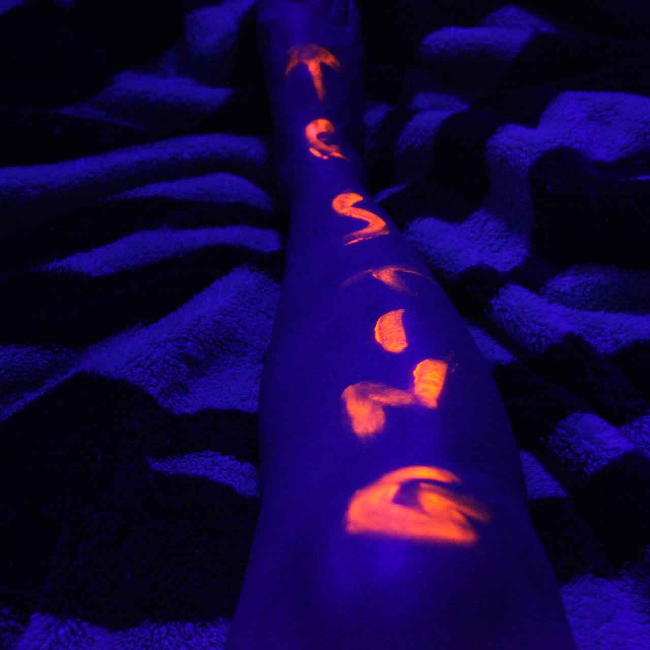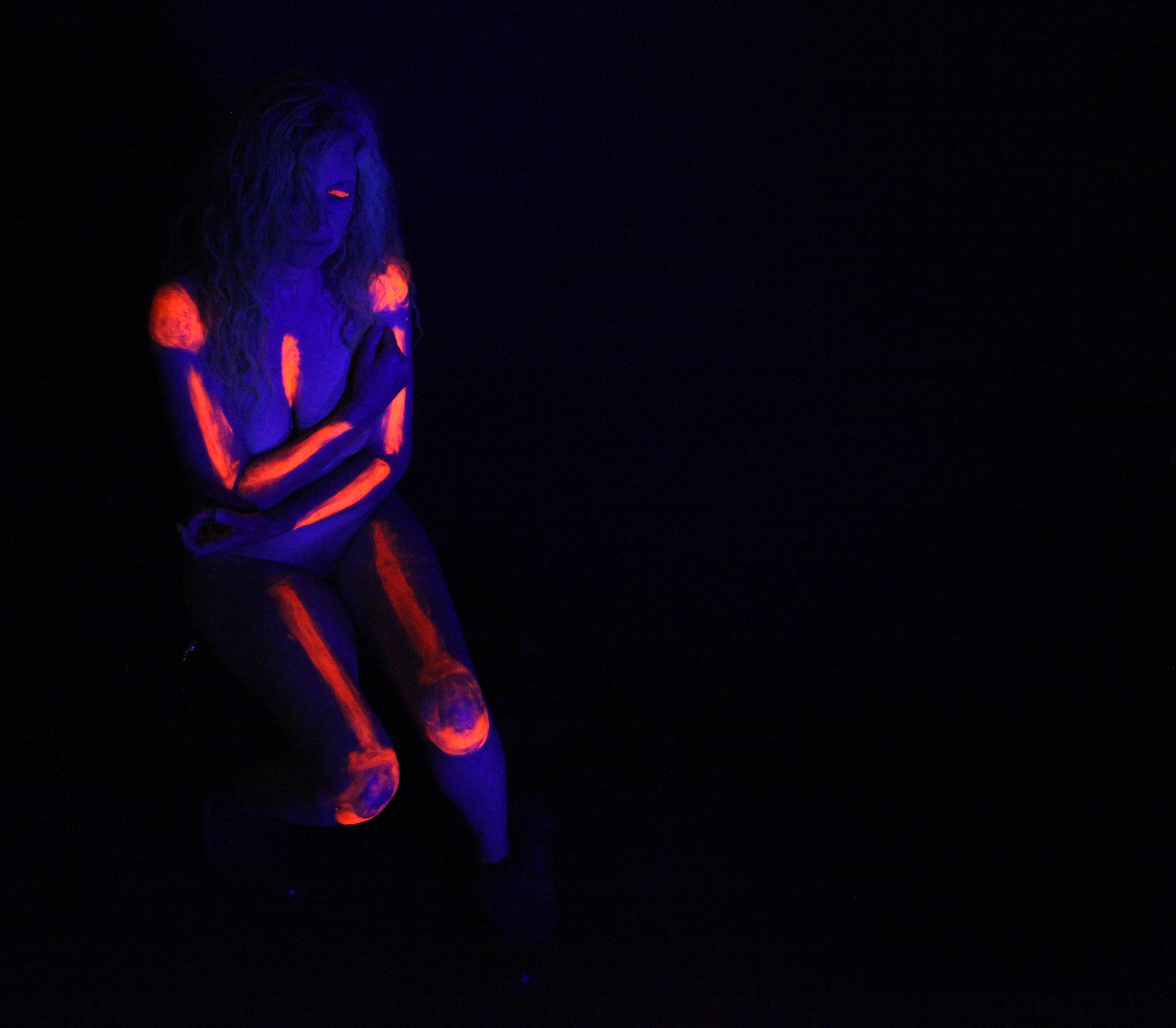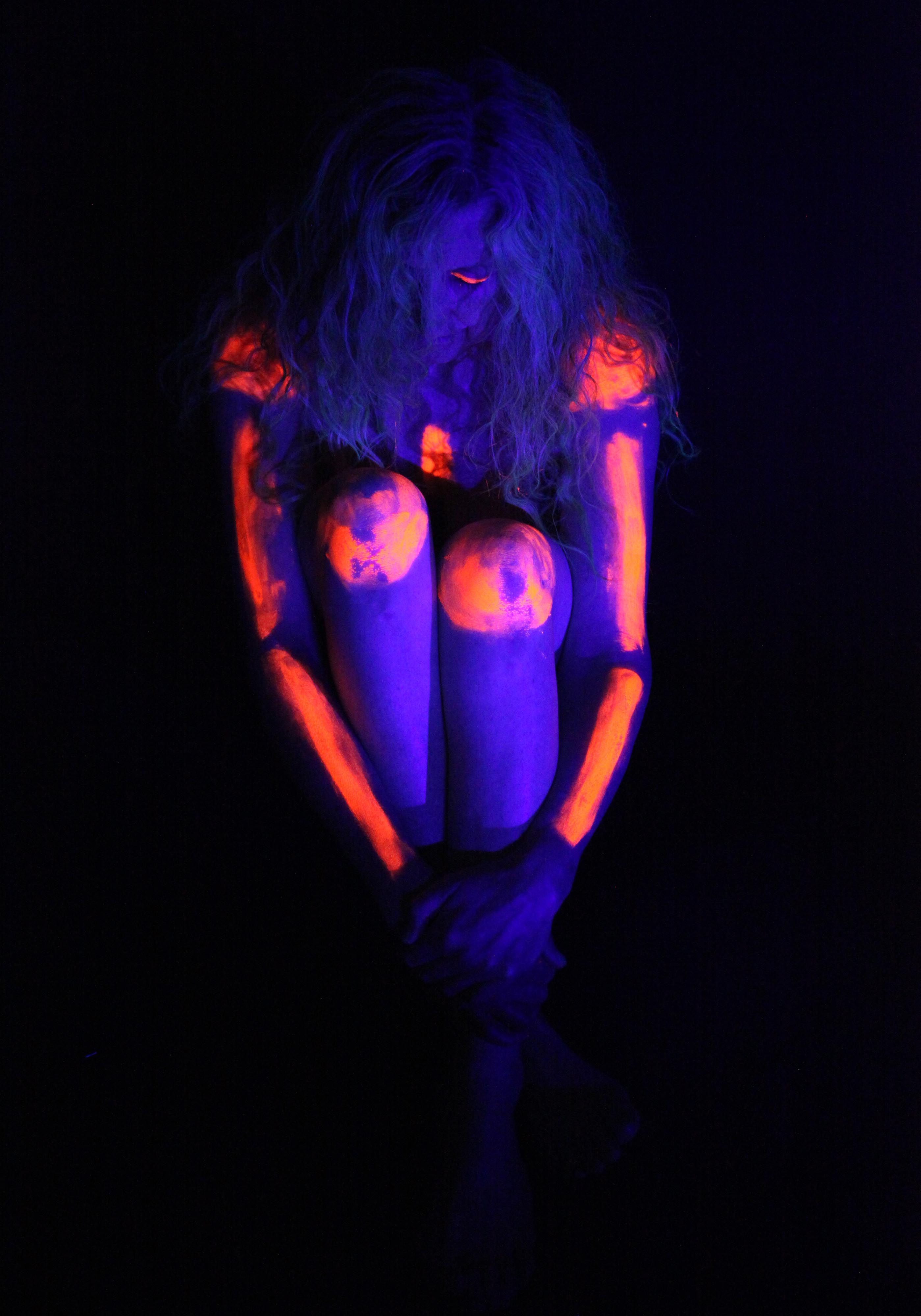 She envisioned using UV paint and light to emphasise the places of pain on her body. We discussed and acquired paint and lights, and I did some test shooting at home to see how it would look and prepare for the photoshoot. It was a very productive trial and gave me a good idea of how to proceed with the photo shoot in the studio.
