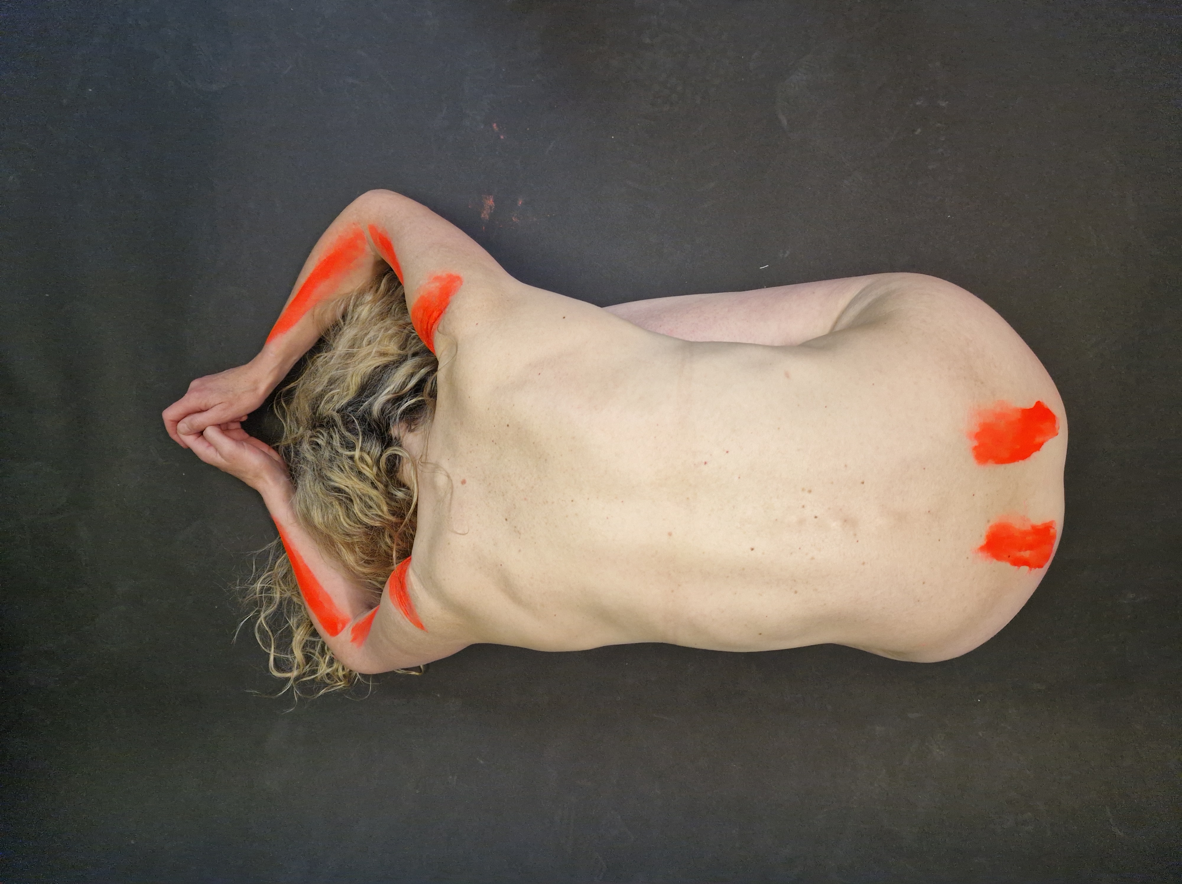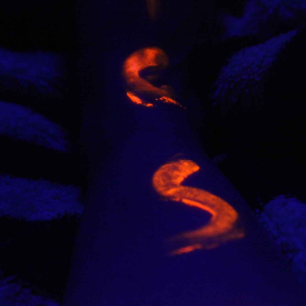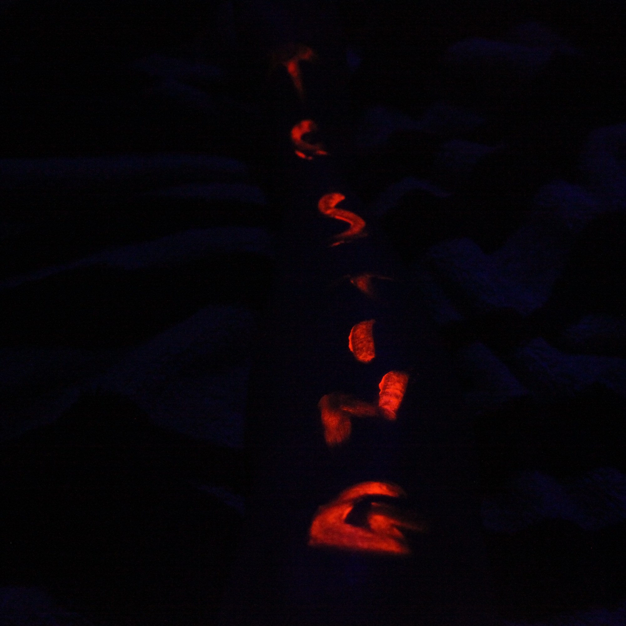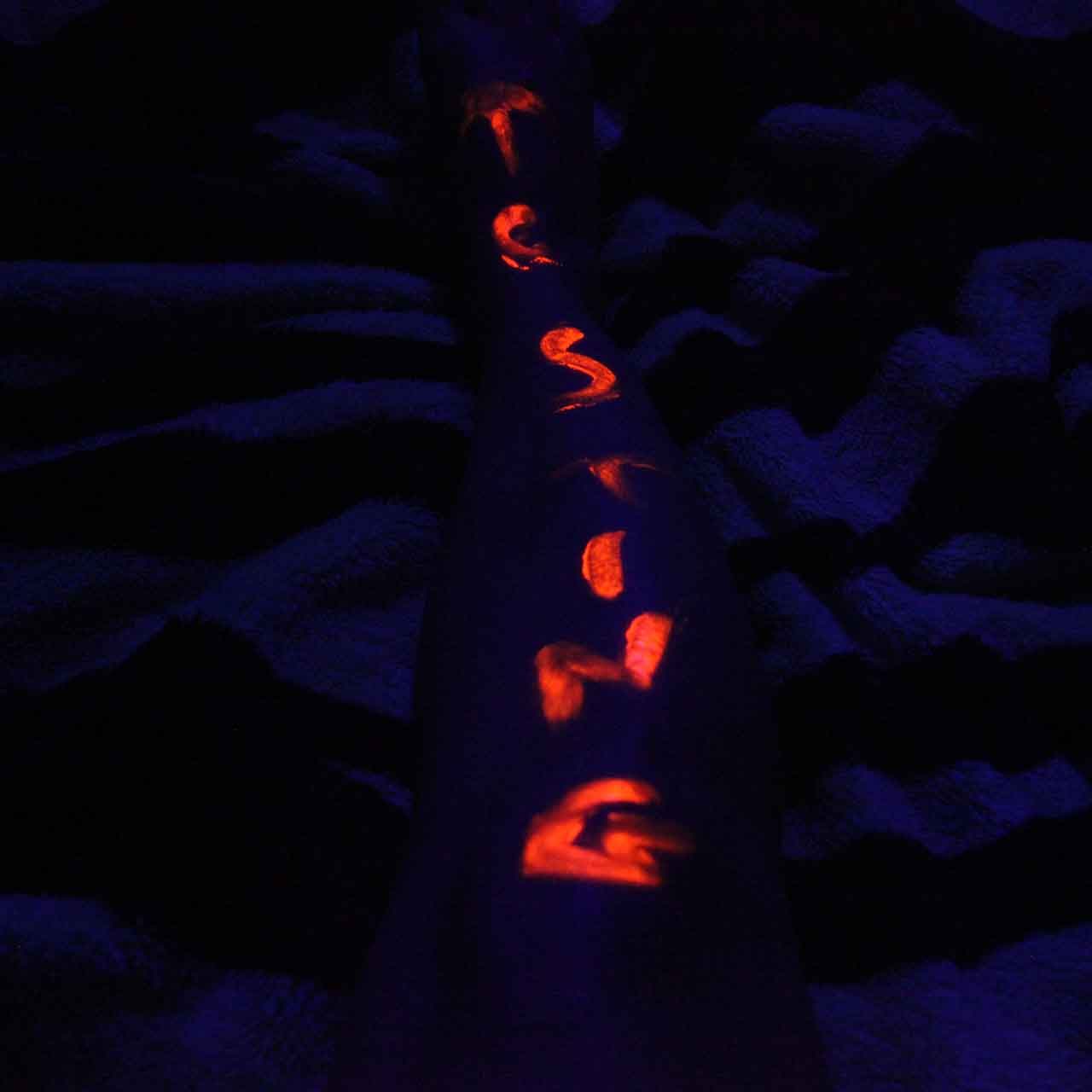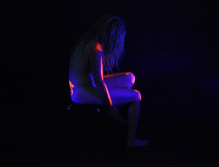 She envisioned using UV paint and light to emphasise the places of pain on her body. We discussed and acquired paint and lights, and I did some test shooting at home to see how it would look and prepare for the photoshoot. It was a very productive trial and gave me a good idea of how to proceed with the photo shoot in the studio.
