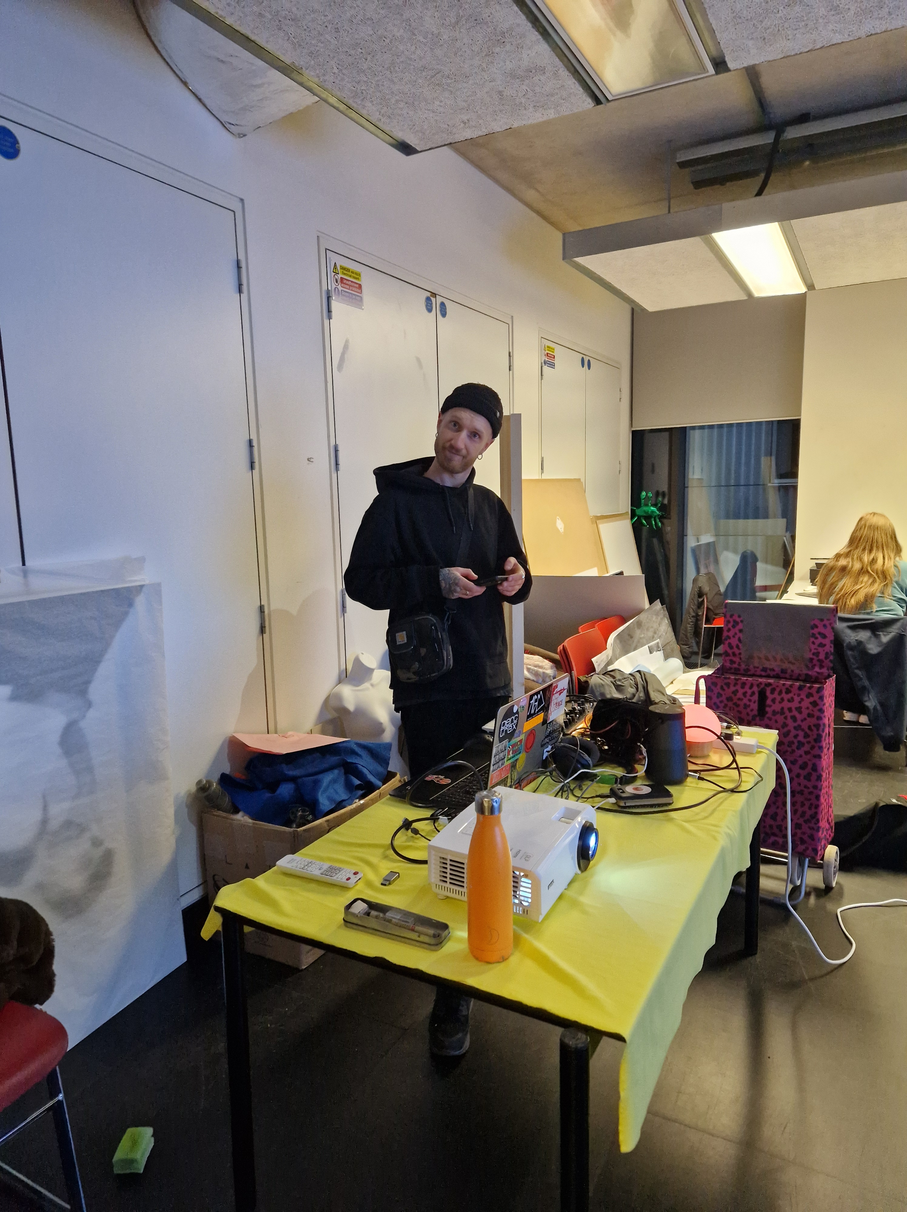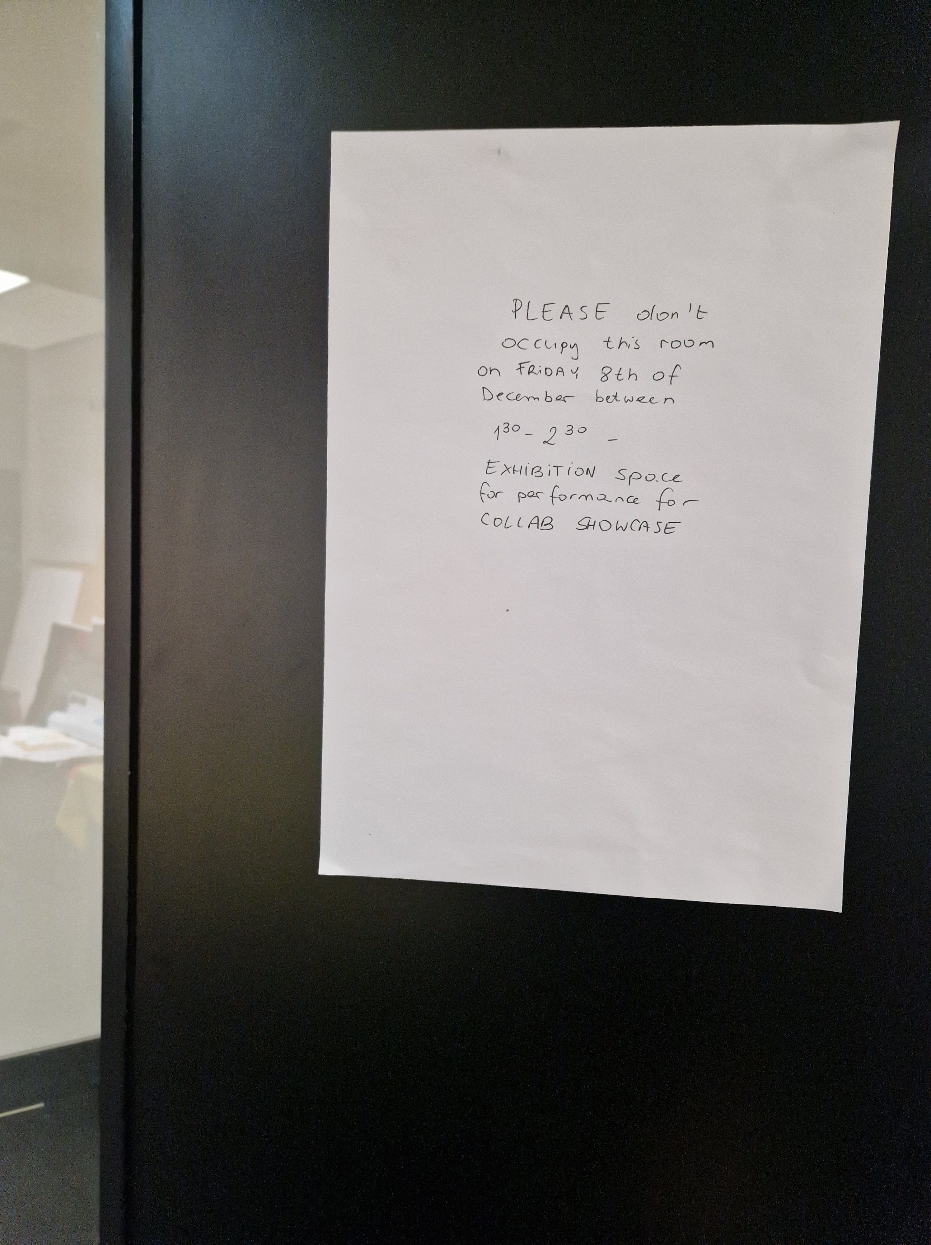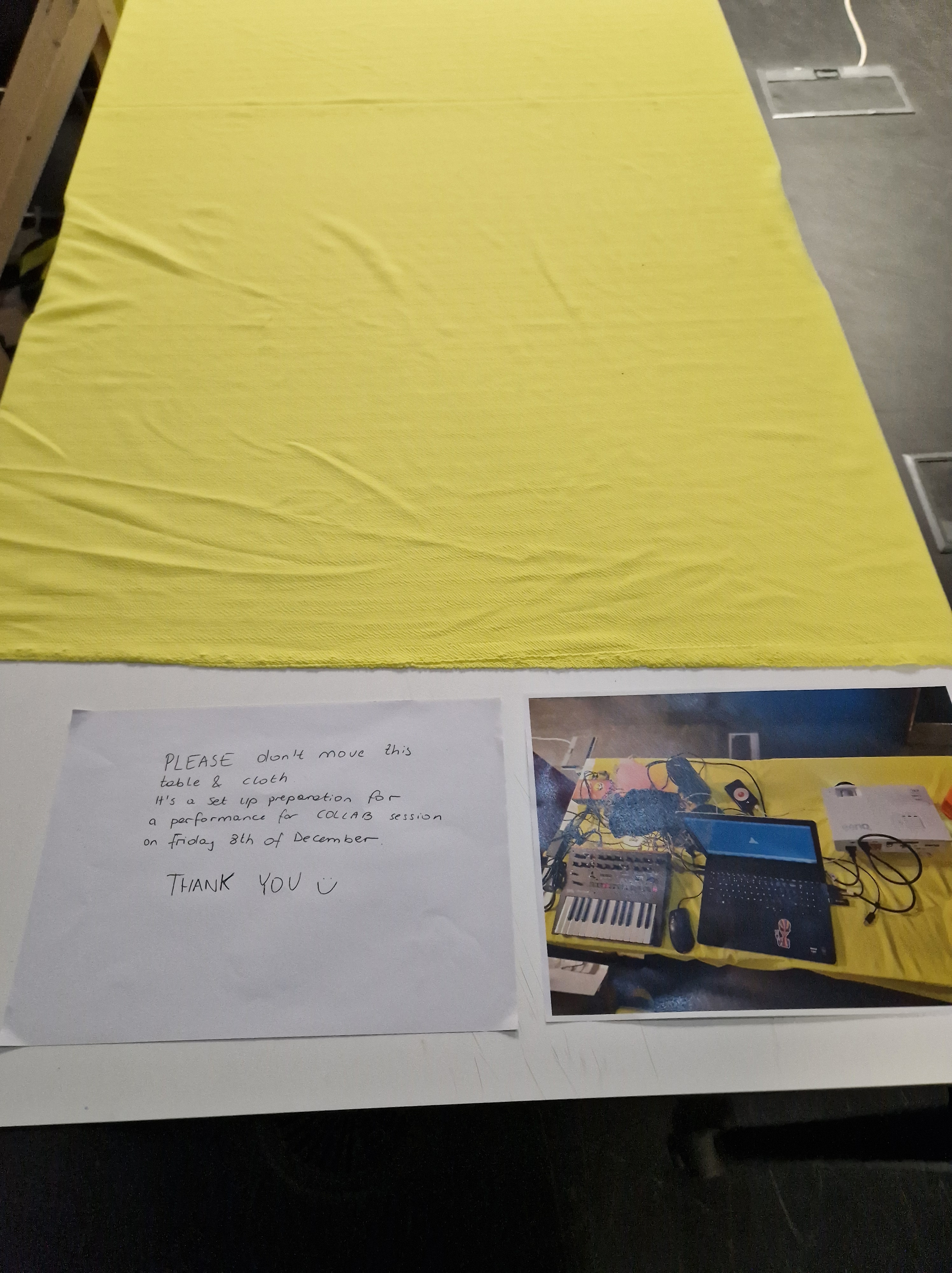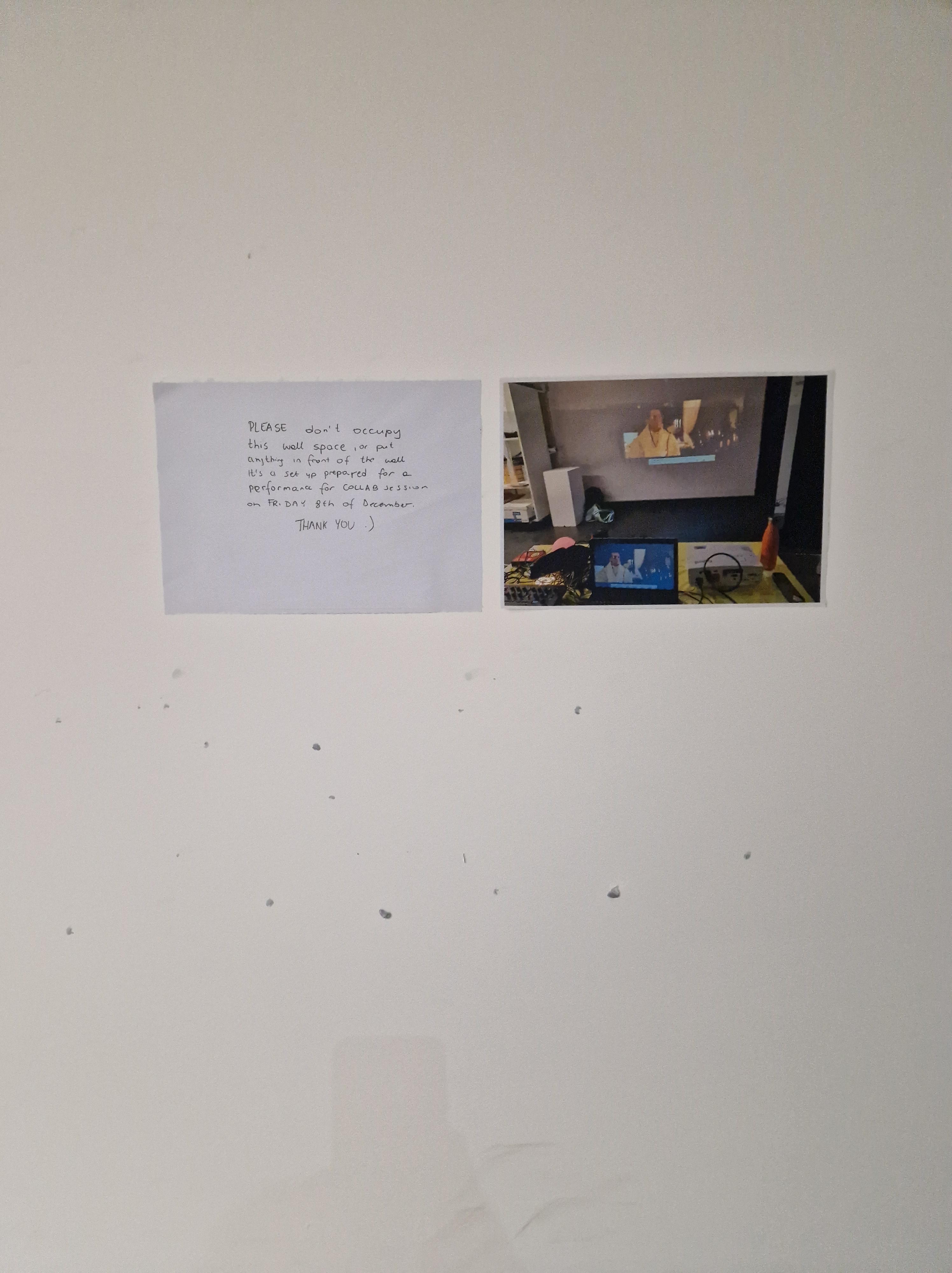 I printed out images and hung them around the space, alongside notes, informing others of this room being used tomorrow so there are no surprises with someone taking over the space. With all the equipment ready and all the testing done, we felt enthusiastic and set to present our collaborative work.
