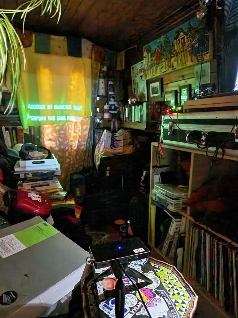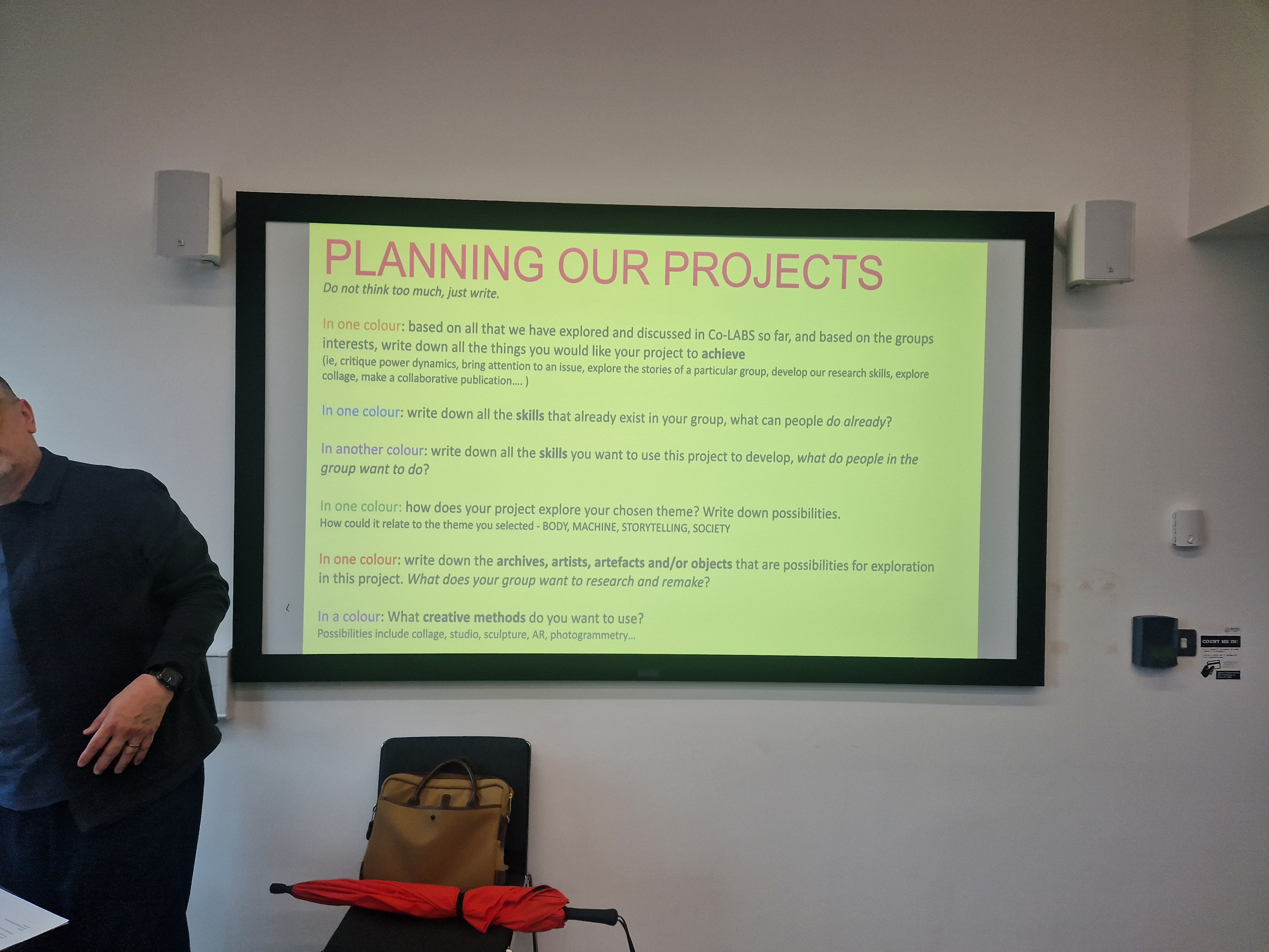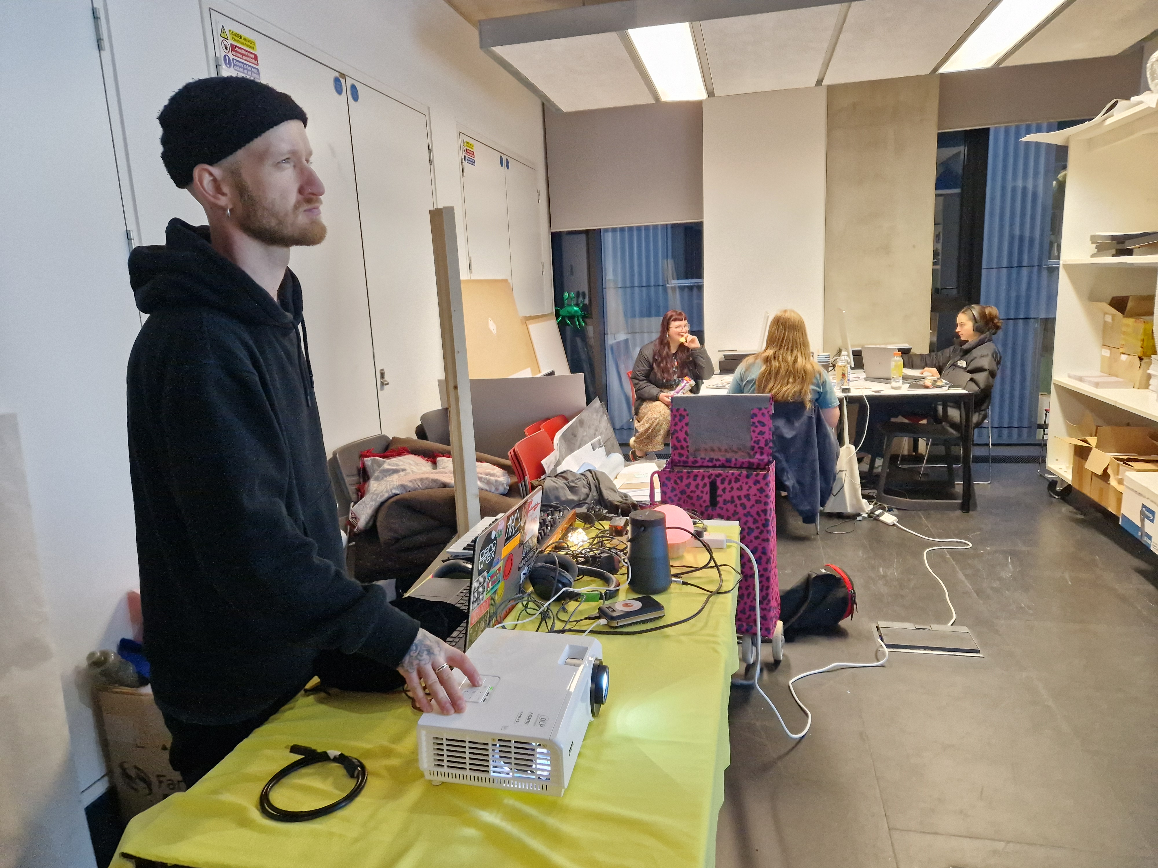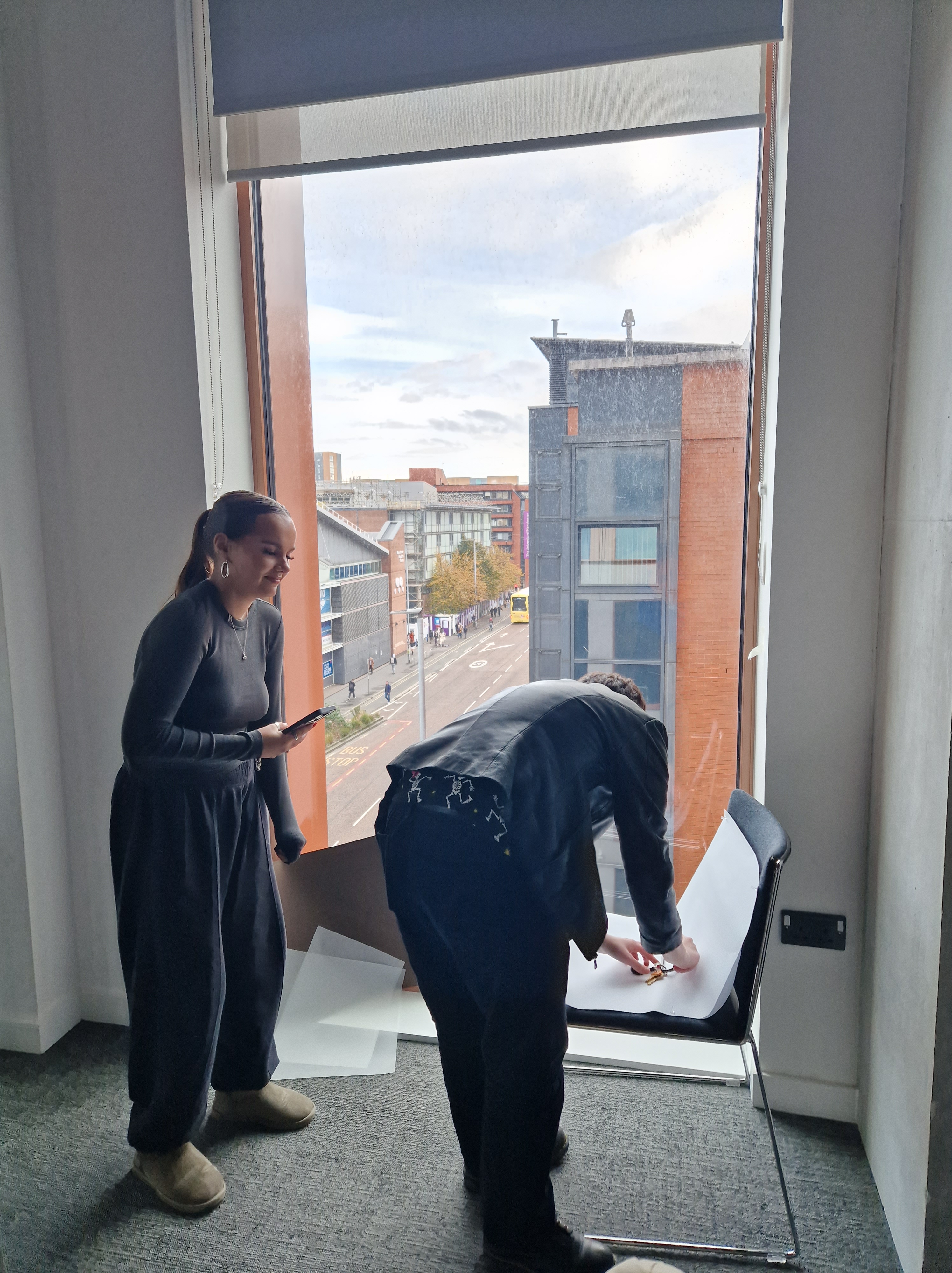I printed out images and hung them around the space, alongside notes, informing others of this room being used tomorrow so there are no surprises with someone taking over the space. With all the equipment ready and all the testing done, we felt enthusiastic and set to present our collaborative work.
