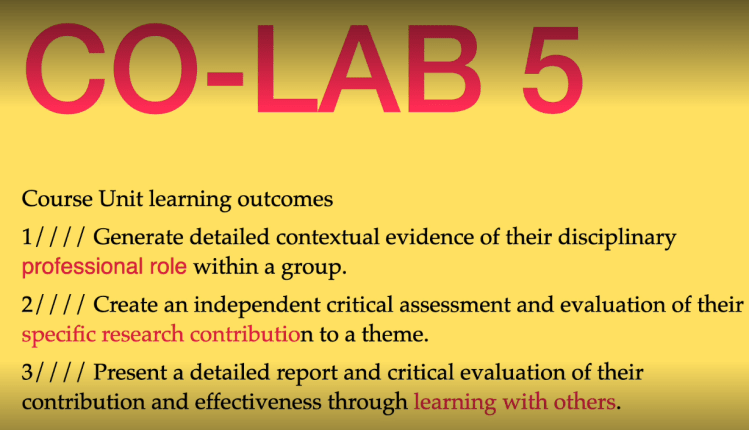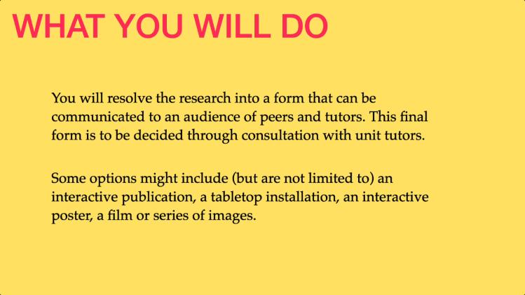 As a group you will collectively resolve the research into a form that can be communicated to an audience of peers and tutors. This final form is to be decided through consultation with unit tutors.