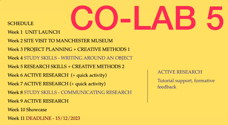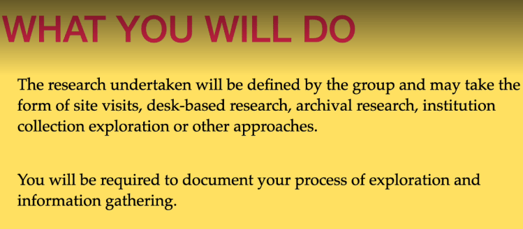 Within this unit you will be carrying out collaborative active research into a relevant collection, institution, object or artifact. The research undertaken will be defined by the group and may take the form of site visits, desk-based research, archival research, institution collection exploration or other approaches. You will be required to document your process of exploration and information gathering.