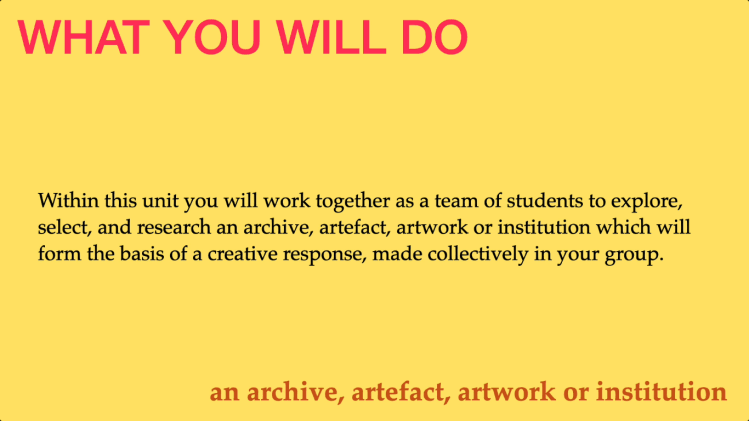 - The archive, artefact, artwork, institution, or idea, that you are exploring. Find research materials in relation to it – images (yours or others), materials from their website