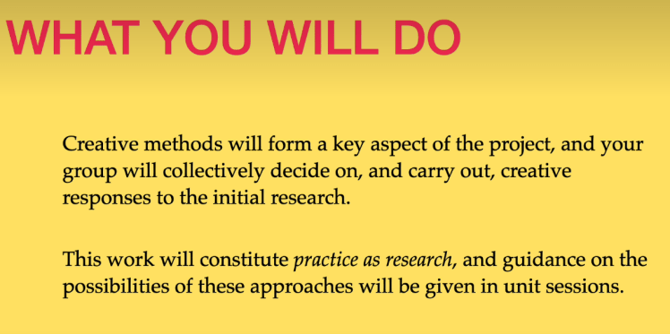 Creative methods will form a key aspect of the project, and your group will collectively decide on, and carry out, creative responses to the initial research. This work will constitute practice as research, and guidance on the possibilities of these approaches will be given in unit sessions.
