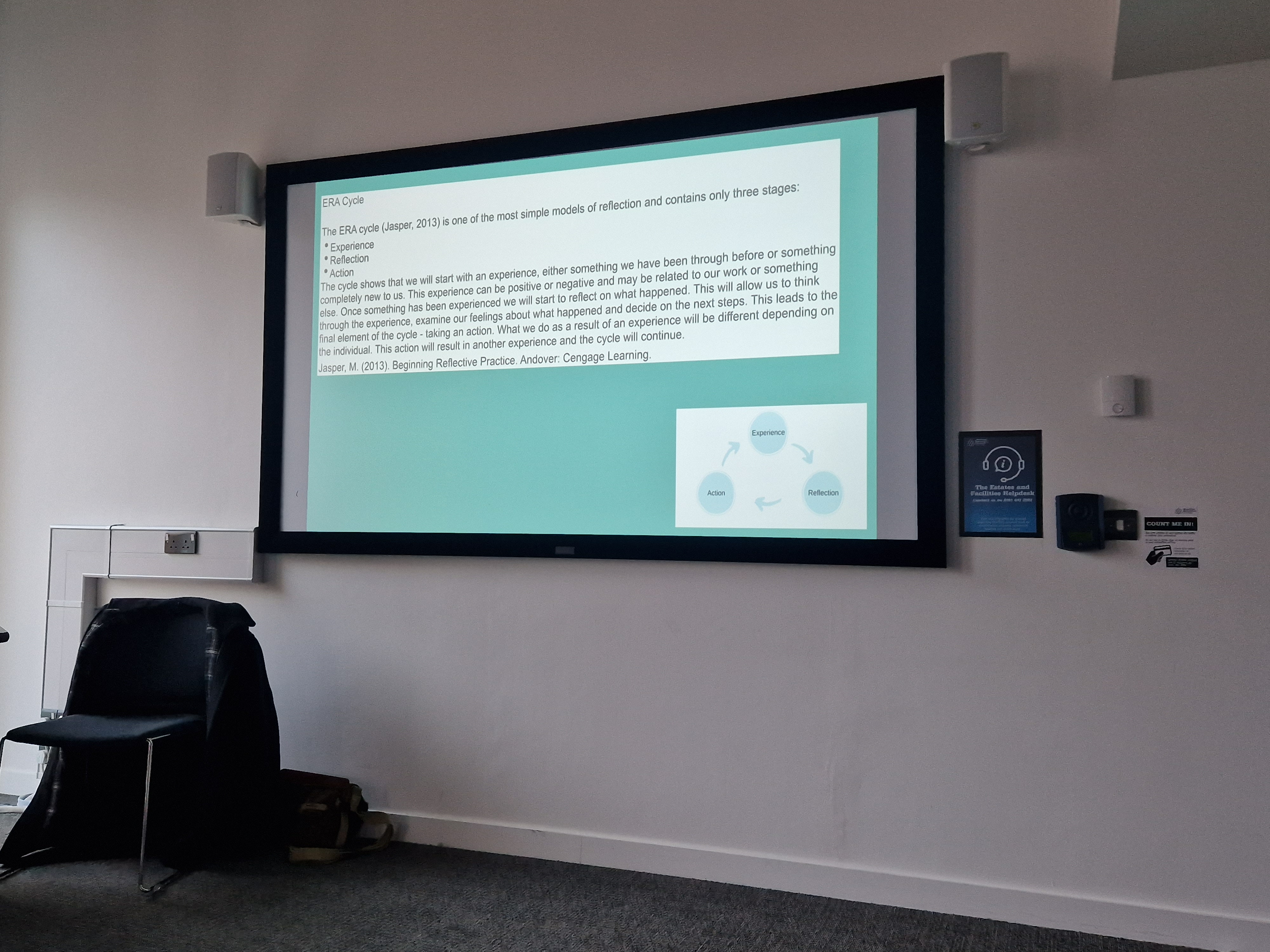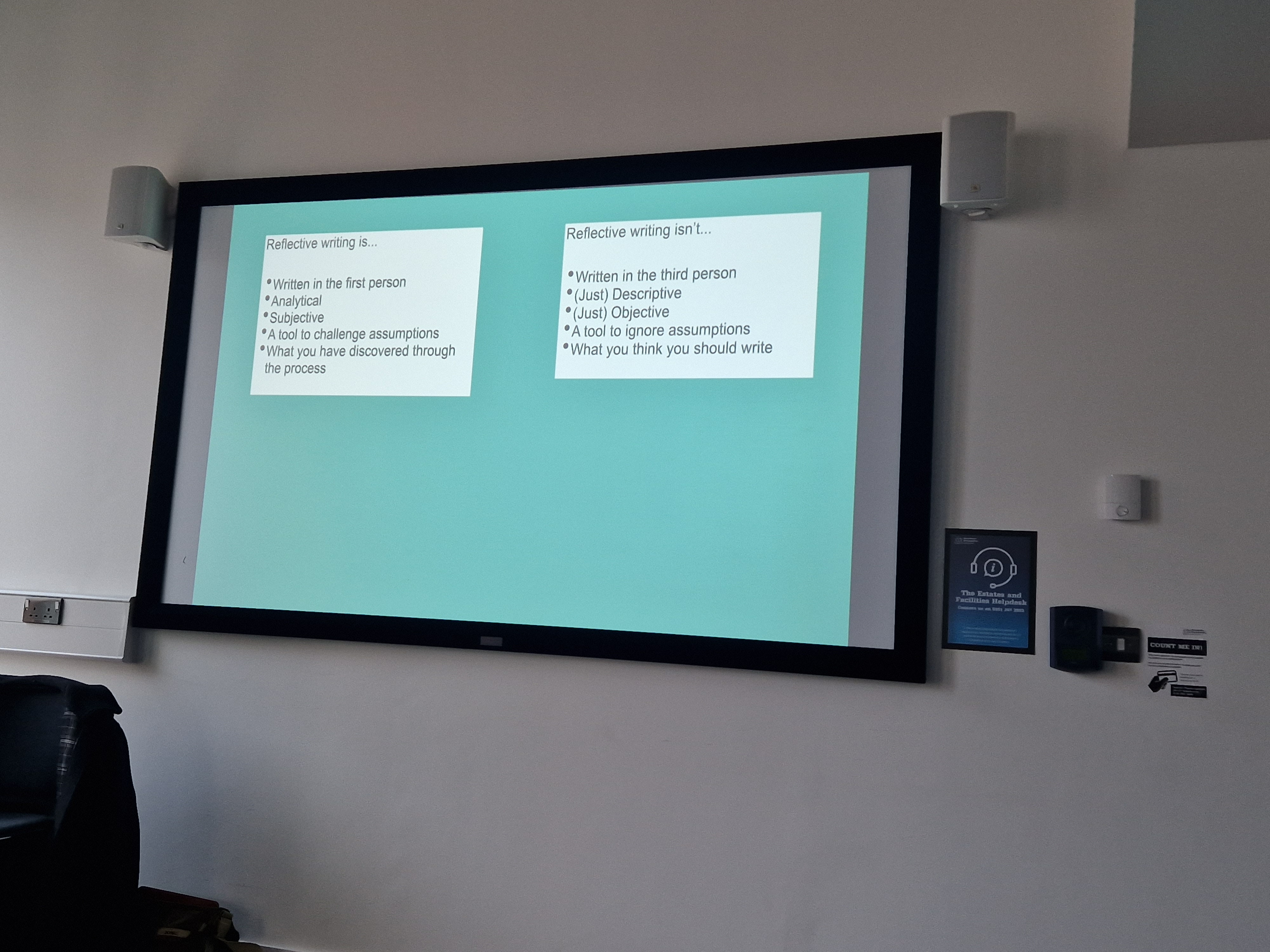 We gave ourselves a good time to set up - 30 minutes, and everything was ready for the tutor's arrival. I was happy to see that quite a few students came as well, as I did not advertise it at all. Overall, we had a decent crowd. I am very proud of my film, and I think it came out very well - it was evident how hard I worked on it.