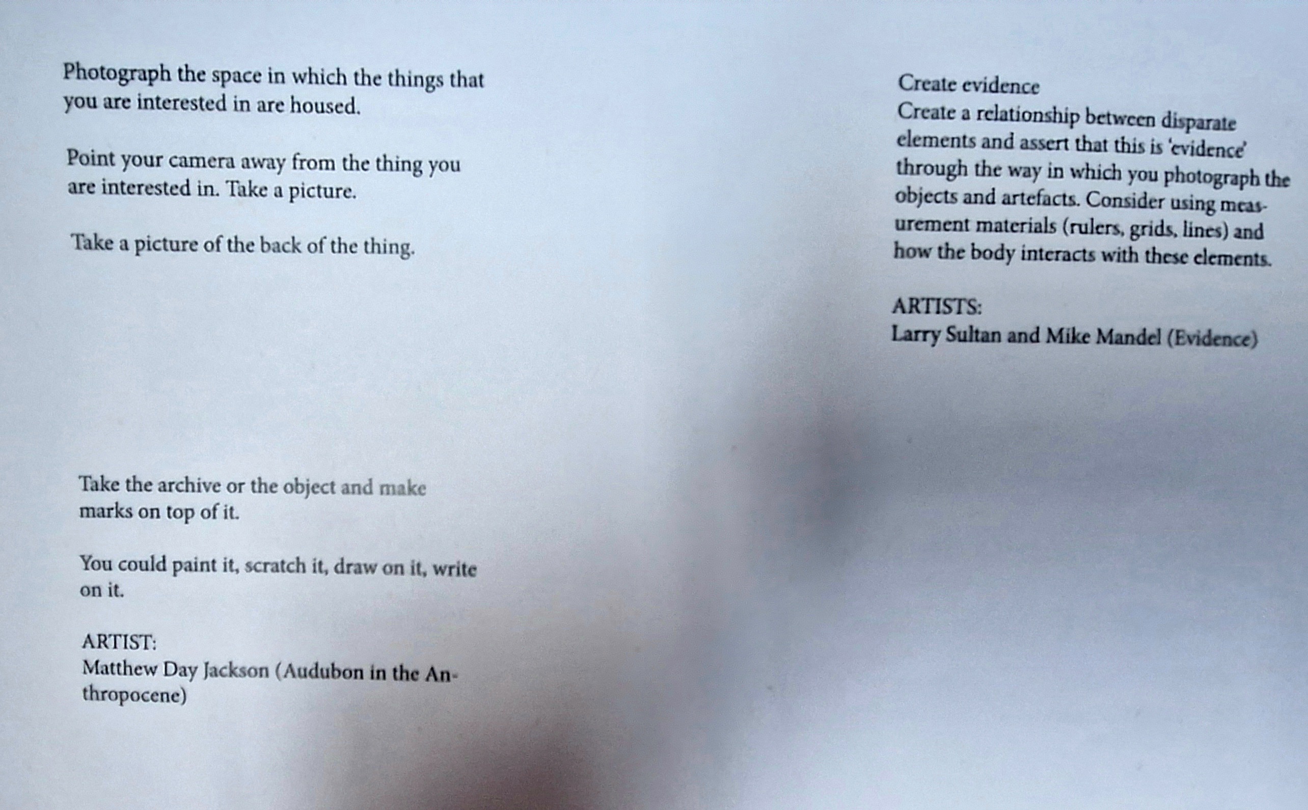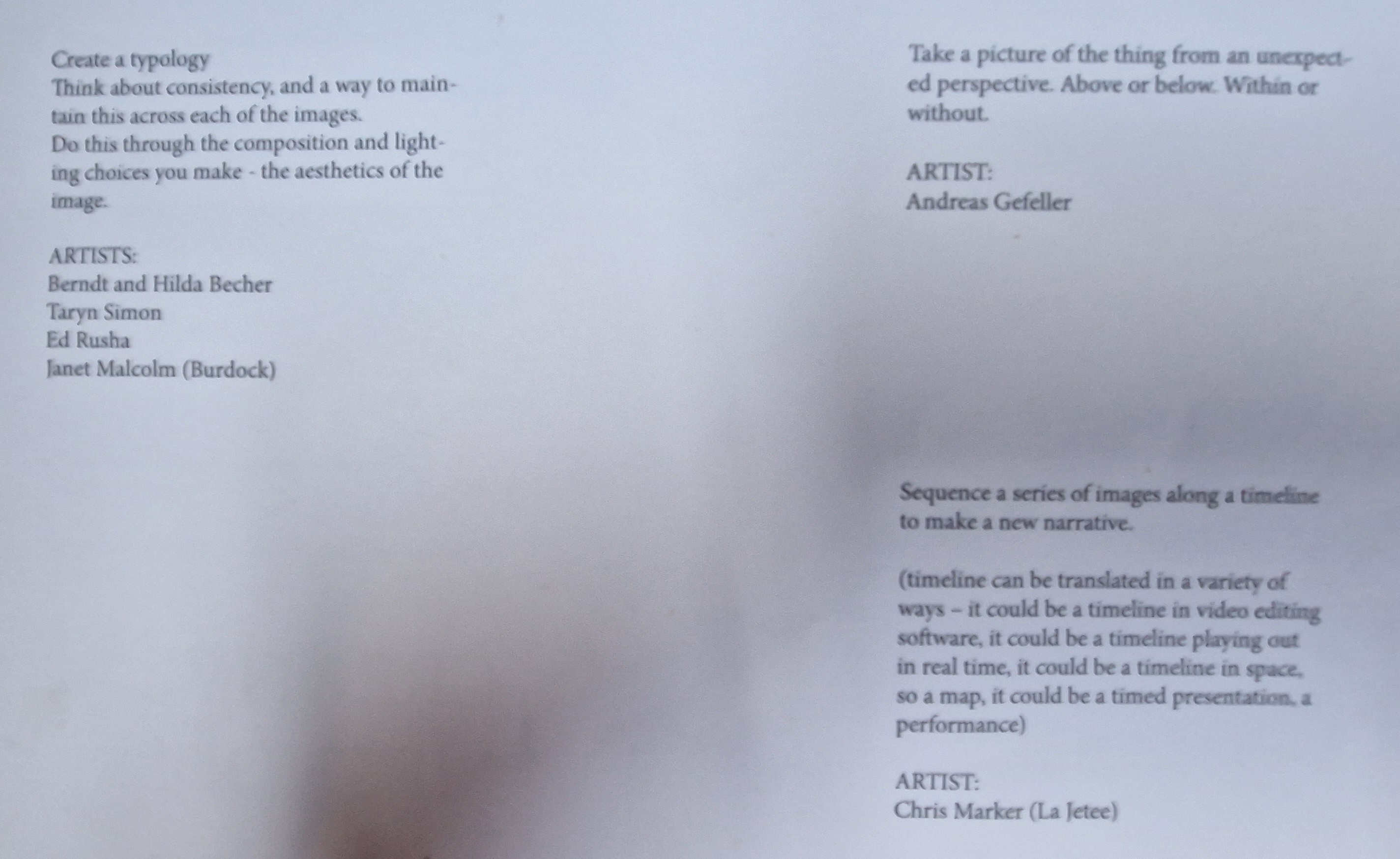 - Academic and written sources that support your ideas. For example, if your work is seeking to interrogate the institution as an idea, you could use the work of Allan Sekula (introduced in week 1). If your work is engaging with ideas of family photography and the vernacular – readings around these themes