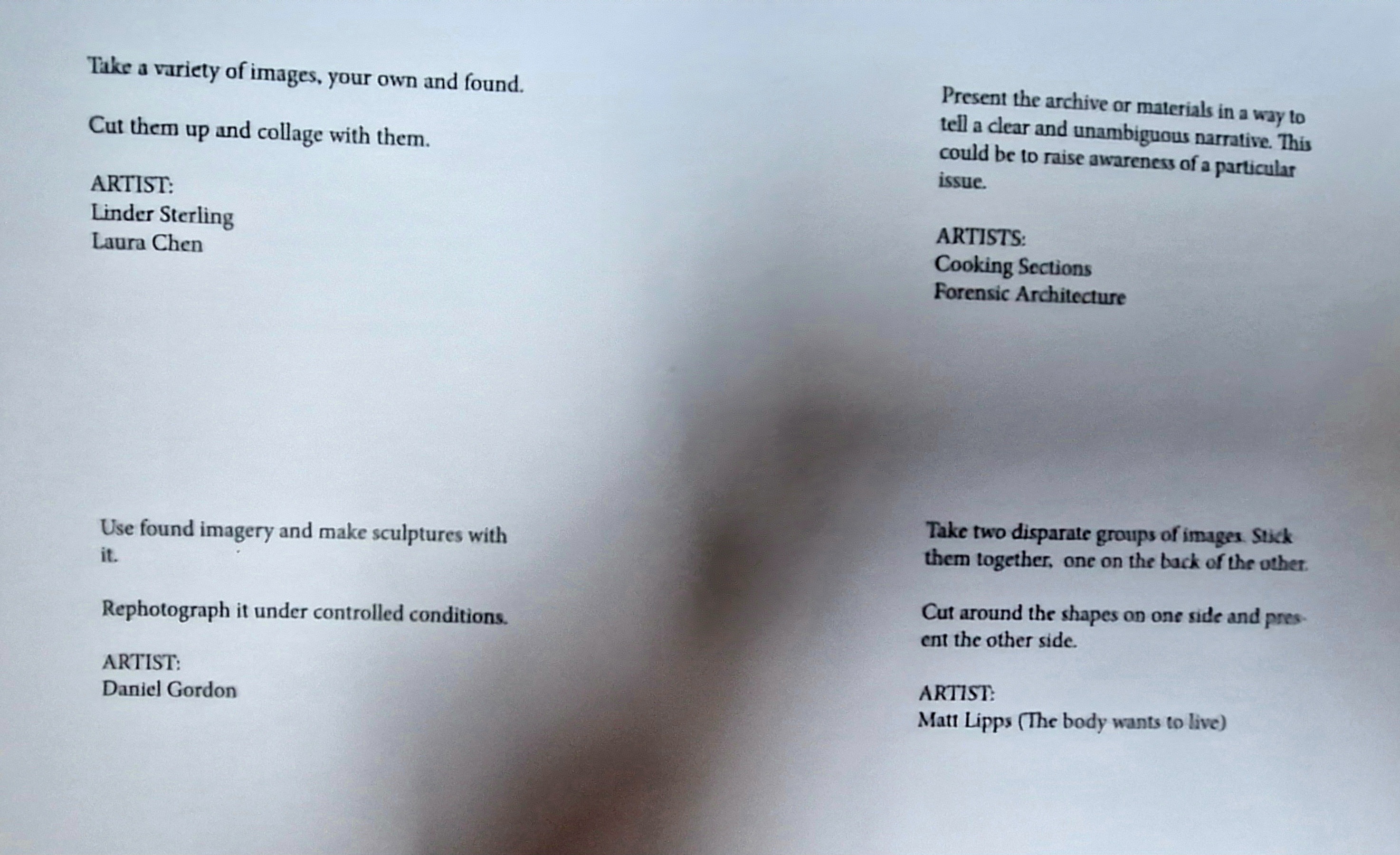 - Writing/reviews etc. Materials that you have found that has influenced your group’s approach. This could be artworks from the creative methods booklet or other photographers and artists, films, media, and their approaches.
