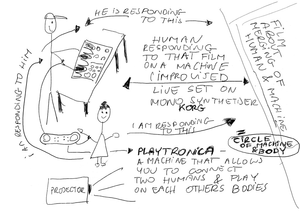 I made this performance plan in which Shaun reacts to the video on the KORG machine, and the PLAYTRONICA machine connects us and allows us to react to each other while I also respond to the video. Through this arrangement, I aim to create a full circle of the machine-body relationship, interaction and connection.